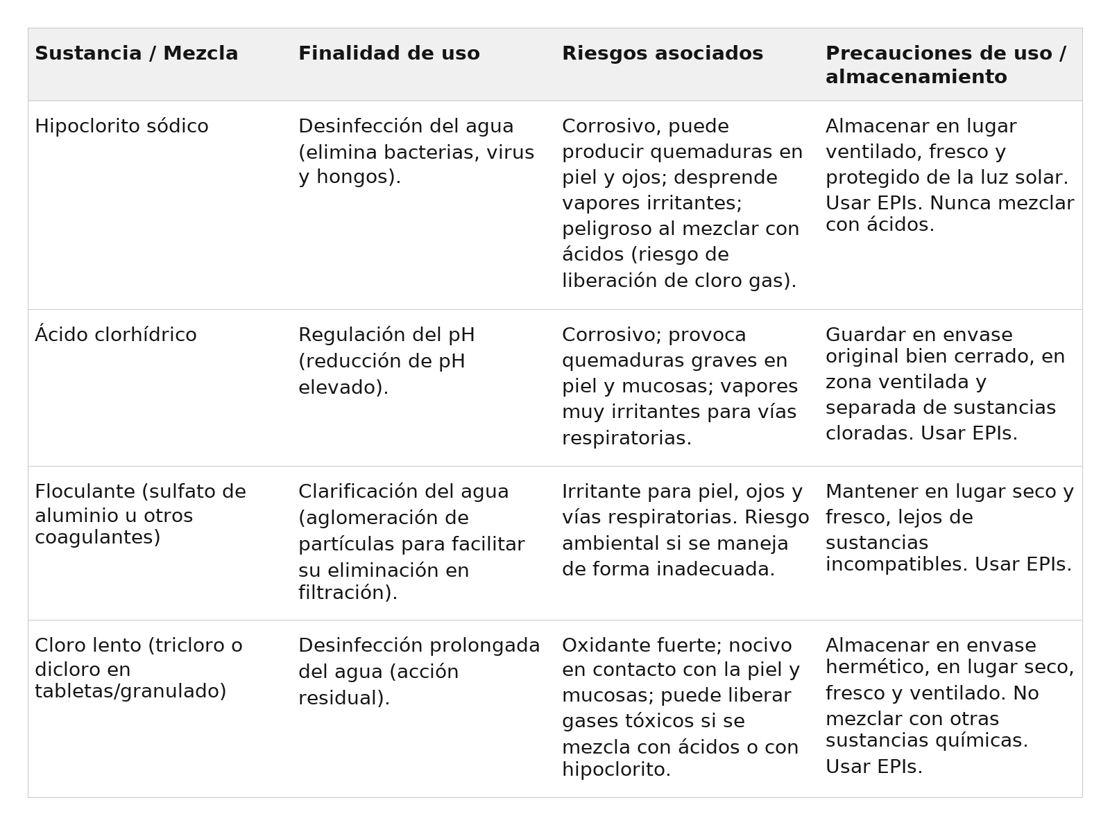 Las sustancias empleadas en el mantenimiento y tratamiento de la piscina son las siguientes:
